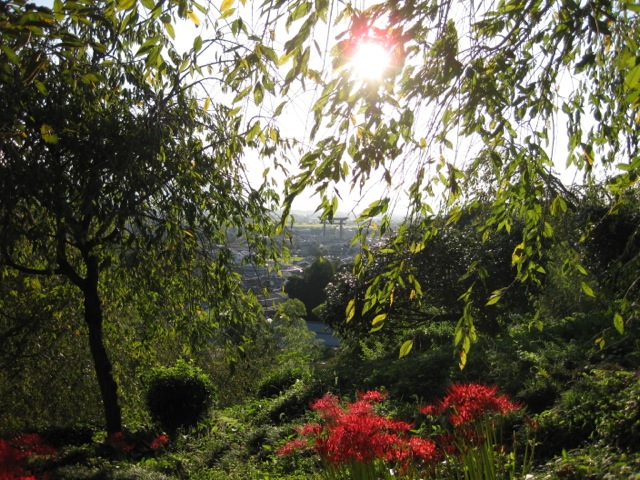 町が一望できます。車を停めた第一の大鳥居が中央右よりに小さく見えます。お解りか。