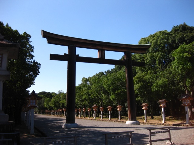 畝傍山の麓にあり、周りは木々や公共施設が並ぶ素敵な立地。とても大きな神社で、正月ともなるとたくさんの参拝客で賑わうそうな。