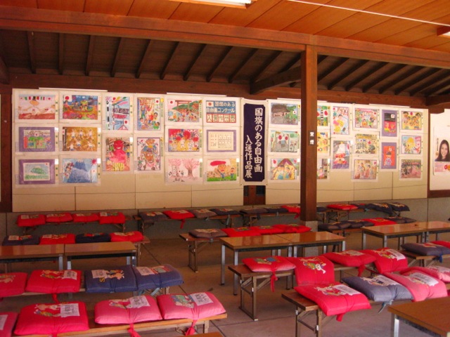 休憩所で「国旗のある自由画展」が。国旗とか君が代とか、何だか避けがちなテーマを敢えてここで?と、少し不思議に思ってたのだが理由は後で察する事となる。