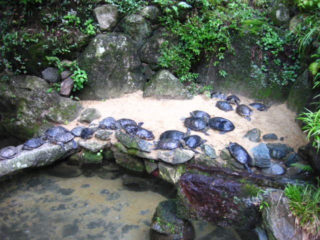 小さな池に、信じられん密度で亀が住んでいる。