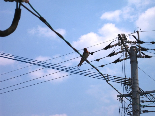 目の前の電線に止まって、玄関を開ける瞬間を待ってるツバメ。