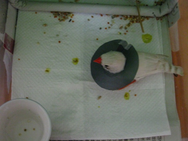 小さいので自然治癒で大丈夫だろうと放置していたが、カサブタを痒がって噛むうちに傷口は広がるはそれに伴い出血も酷いものになったので、小鳥・小動物専門の獣医さんまで足を伸ばす事に。