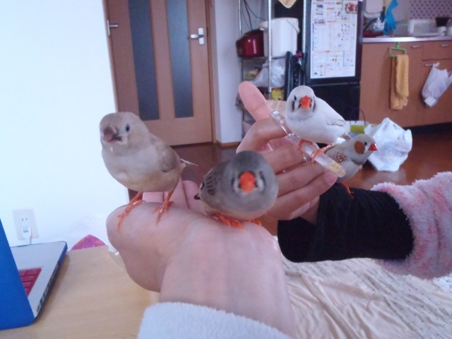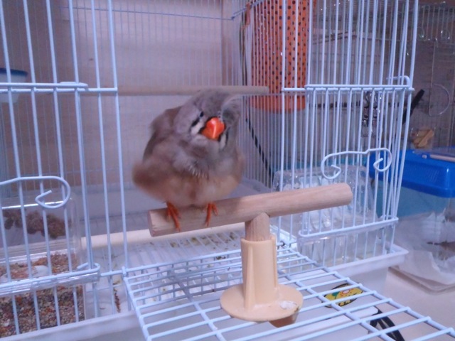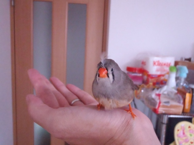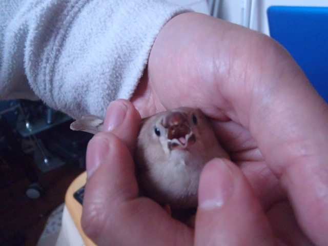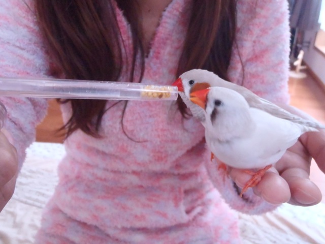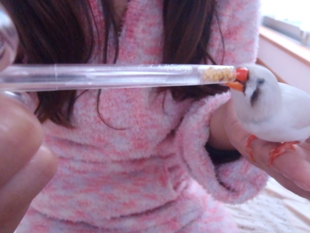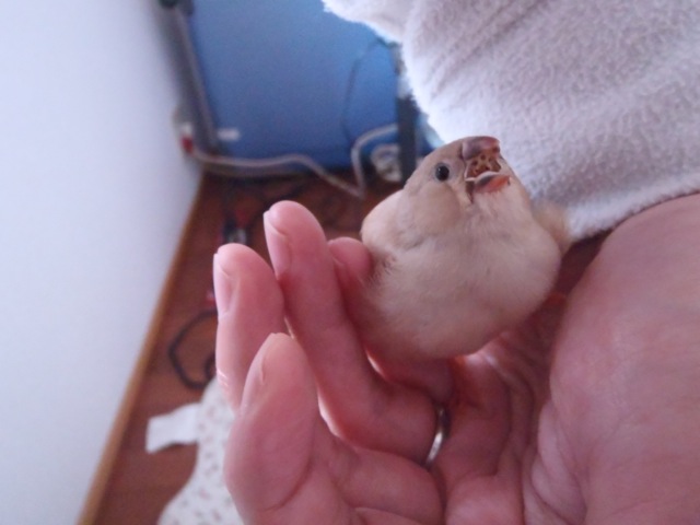 結構育ってるので、一日4回程度の差し餌でOK。ちょっと寂しいけど楽です〜。1羽で食べてると食いつきが悪い気がします。競争相手が居る方がクレクレ度が増す気が。
