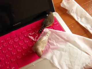 以前は、タンスの上やらカーテンのたわみ部分に巣を作ろうと必死になってた夫婦だけど、それもなく。