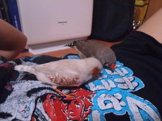 Tシャツのプリントをはみはみするのが好きな2羽。