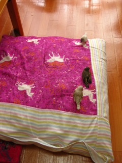 ガーゼ素材が気持ちいいのか、キンカ一族に占領されました。
