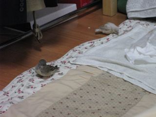 たくさん飛べるようになってきて、とうとうカーテンレルの上に。